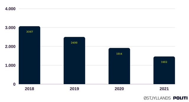 I 2021 fik Østjyllands Politi 1.462 anmeldelser fra borgere, der havde haft indbrud i deres hjem. Det er en nedgang på over 20 procent i forhold til året før, og en halvering af tallet fra 2018, hvor der blev registreret lidt over 3000 indbrud i private hjem.