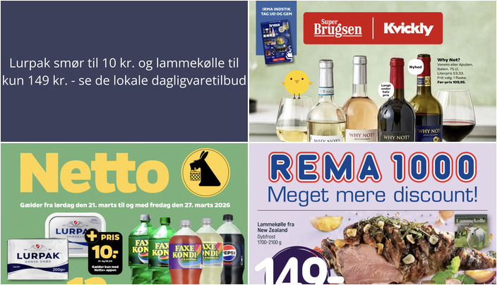 Rema 1000 har et godt tilbud på dybfrost lammekølle fra New Zealand, som vejer mellem 1700-2100 g. Prisen er 149 kr., hvilket svarer til en maks. kg-pris på 87,64 kr. Tilbuddet gælder fra søndag den 22. marts til lørdag den 28. marts.